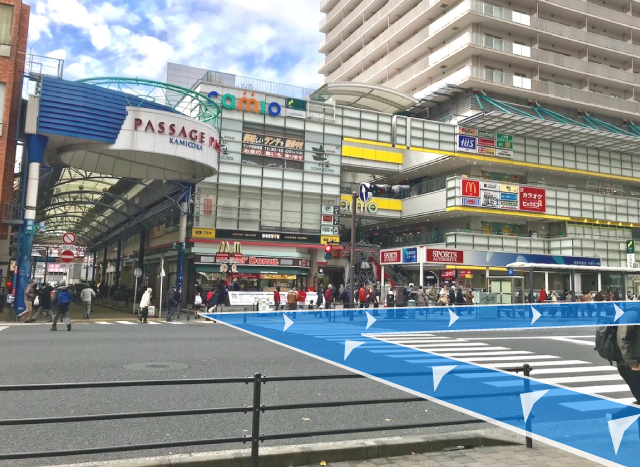 ① 京急本線「上大岡駅」西口を出て、商業施設前の横断歩道を渡り、右(鎌倉街道 関内方面)へ進みます。 -