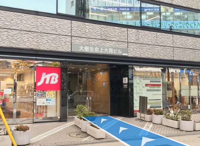 ④ 道なりに進むと、左側に「大樹生命上大岡ビル」(1階JTB旅行会社)がございます。